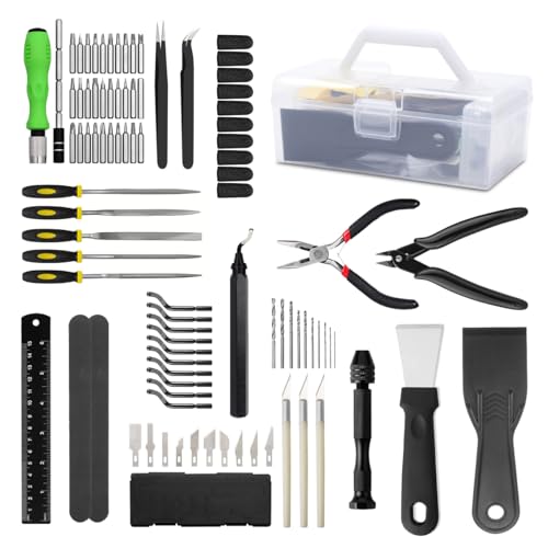 Complete 90+ Piece 3D Printing Toolkit: Everything you need in one box: 1×Plastic Scraper, 1×Stainless Scraper, 1×Curved/Straight Tweezers, 1×Wire Cutter, 1×Needle-nose Pliers, 5×Files, 2×Sanding Sticks, 1×Aluminum Ruler, 1×32IN1 Screwdriver Set, 1×Metal Deburring Tools + 10 Blades, 1×Art Carving Knife Handle + 13 Blades, 1×Hand Drill Bits + 10 Twist Drills, 10×Anti-cut Gloves, 1×Storage Box. No more buying tools separately!
