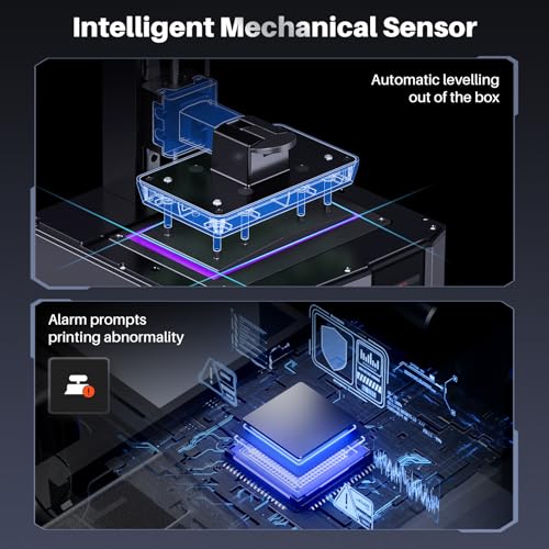 【Intelligent Mechanical Sensor】Mars 5 Ultra Printer features a built-in smart mechanical sensor and spring for one-click calibration. It detects printing issues like low resin, foreign objects, or high light board temperature, with alerts. The printing process resumes after an interruption