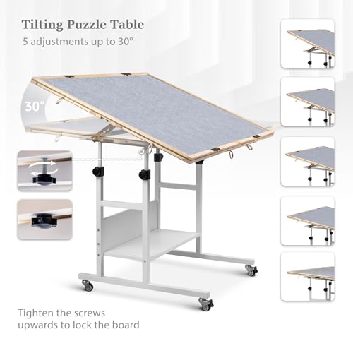 5 Angle Adjustments – Set up the tabletop at one of the 5 tilt angles (30° max) to enjoy puzzling in your best comfort and reduce discomfort during long hours of playing. Tabletop is covered with soft felt fabric to ensure enough friction to stop puzzle pieces from slipping and falling on a slant.