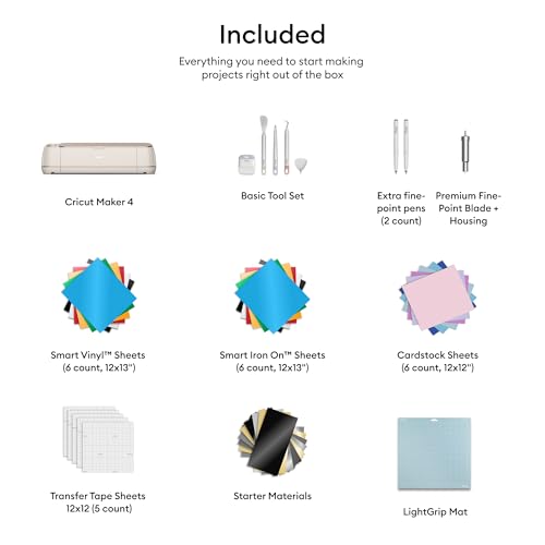 Cricut Maker 4 – Smart Cutting Machine (Seashell) | Engagement Bundle – Includes Smart Vinyl, Cardstock, Transfer Tape, Iron On HTV, Mat, Pens, Tool Kit, & 25 Images in Design Space App
