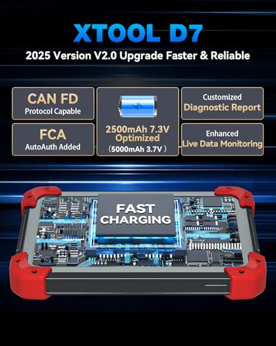 2025 XTOOL D7 OBD2 Scanner – Enhanced Performance & Expanded Vehicle Coverage: The 2025 XTOOL D7 obd2 scanner diagnostic tool with bidirectional is perfect for both DIY enthusiasts and professional mechanics, offering faster diagnostics, longer battery life, and wider vehicle compatibility. Its upgraded 5000mAh battery (with 2500mAh 7.3V fast-charging) ensures all-day use. With new support for FCA, CAN FD, and DOIP, it covers more vehicle models. The enhanced V2.0 Diagnostic Report lets auto shops personalize reports with logos, customer details, and attachments, building trust, strengthening business identity, and providing personalized records for future reference
