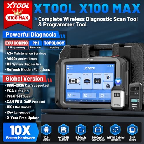 2025 XTOOL Comprehensive Diagnostic & Programming Tool: XTOOL X100 MAX is an advanced wireless obd2 scanner diagnostic tool built for professionals, repair shops, and serious DIYers. It provides full-system diagnostics, ECU programming/coding/configurations, 42+ services, 4K+ active tests, intelligent topology mapping, pre/post scan, 20X faster wireless connection. This auto diagnostic code scanner delivers the power and precision needed for modern vehicle diagnostics. Covers 10,000+ models with FCA AutoAuth, CAN FD, and DoIP protocol support. Available in 24+ languages for global use