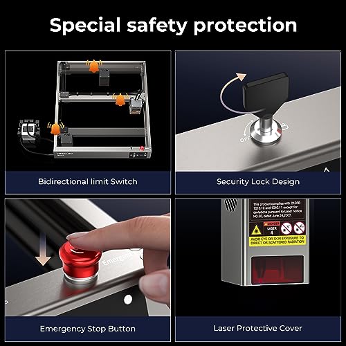 Five Safety Protections -This laser engraving machine is equipped with advanced safety features, a flame detector, a bidirectional limit switch, a safety lock, an emergency stop button, and a laser detection cover. Minimize accidental operation and ensure safety and reliability.