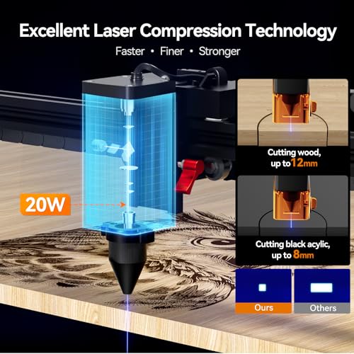 Cutting Depth & Speed: A 20W laser module delivers significant performance upgrades over 10W and 5W models. 2x deeper cuts vs. 10W and 4x faster than 5W. Engraves hard metals (Stainless Steel) with precision, where 10W leaves faint marks and 5W fails.Cuts denser woods (oak, plywood) cleanly, reducing charring seen with weaker lasers