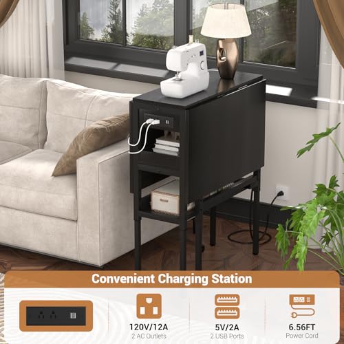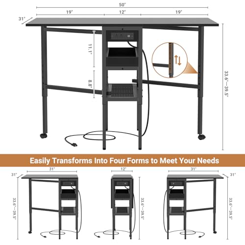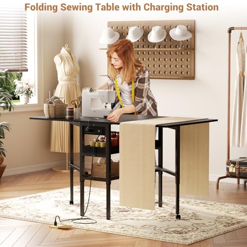 Besiost Folding Sewing Cutting Table with Charging Station, Height Adjustable Craft Table with Storage, 50″ Foldable Fabric Cutting Tables for Sewing Room Craft Room, Black