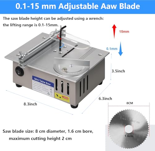 Mini Table Saw, 96W Mini Desktop Electric Saw Cutter 7.1″x5.5″, Cut Thickness Adjustable Precision Craft Table Saw with Speed