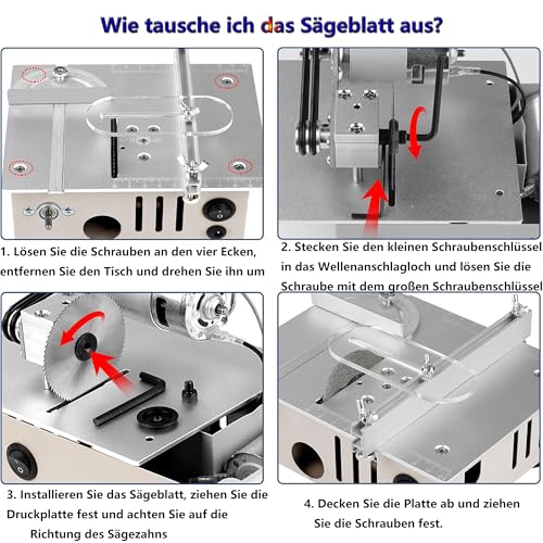 ⚙️Packing list: 1* mini table saw body, 1* power adapter, 4* saw blades, 3* screwdriver, 1* protective cover, 1* instruction manual, 1* bevel cutting gauge, 1* bevel stopper. Note: Please unplug the power supply before replacing the saw blade.