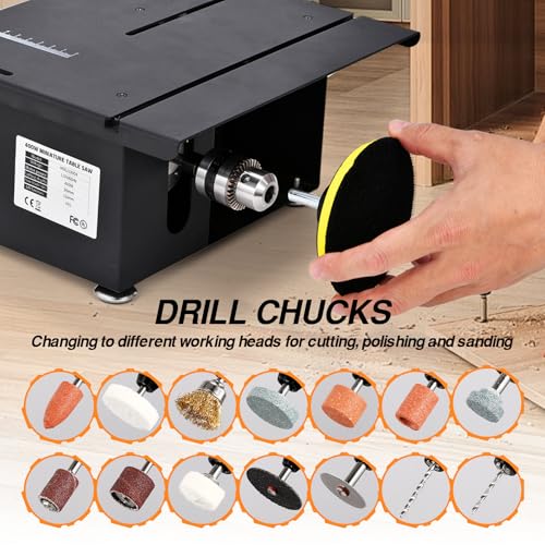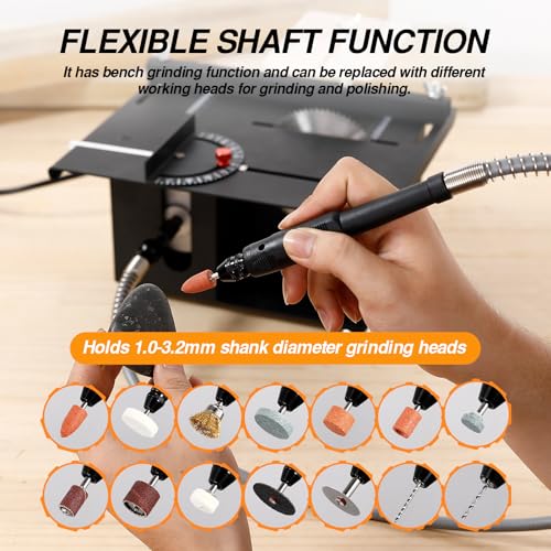 【Accurate Cutting】VISLONE portable table saw’s panel has clear markings to ensure stable, accurate, and straight cuts. The integrated cast iron body is sturdy and durable, suitable for long-term use. Transparent baffles prevent debris from splashing, and the bottom corners are equipped with anti-slip and shock-absorbing rubber feet to prevent shifting during operation. VISLONE mini multi-functional table saw also includes a soft shaft that can hold drilling heads with shank diameters of 1-3.2mm.