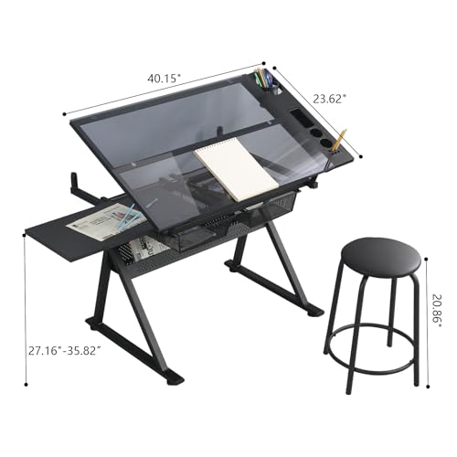 Black Drafting Table w/Stool, Painting Table Art Craft Desk Crafting Table with Tilting Tempered Glass Top, 2 Storage Drawers, Height Adjustable