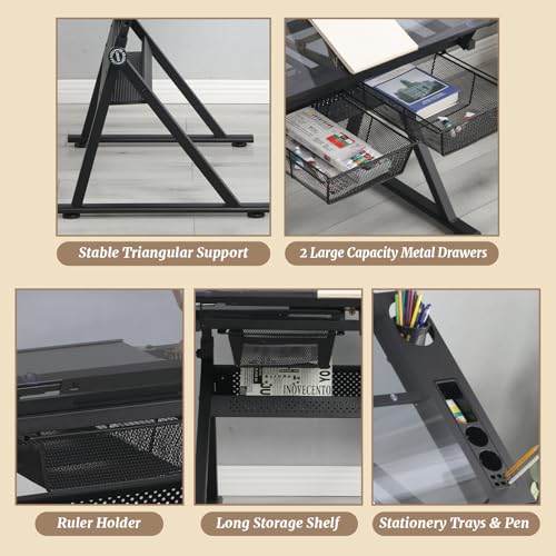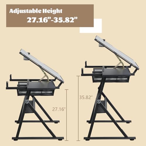 【Sturdy & Stylish Construction】Crafted with premium full-transparent glass surface, complemented by a durable powder-coated iron frame, this adjustable height drafting table exudes elegance while ensuring solid stability. Equipped with nonwoven drawers, it seamlessly accommodates all your essential tools, making it ideal for drawing, crafting, and painting alike