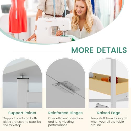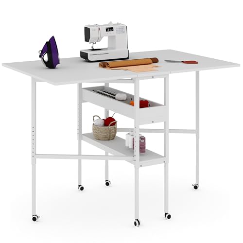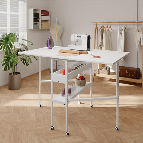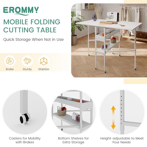 EROMMY Height Adjustable Sewing Table Foldable with Storage Shelves, Mobile Folding Craft Table for Large Fabric, Home Office Sewing Room Craft Room