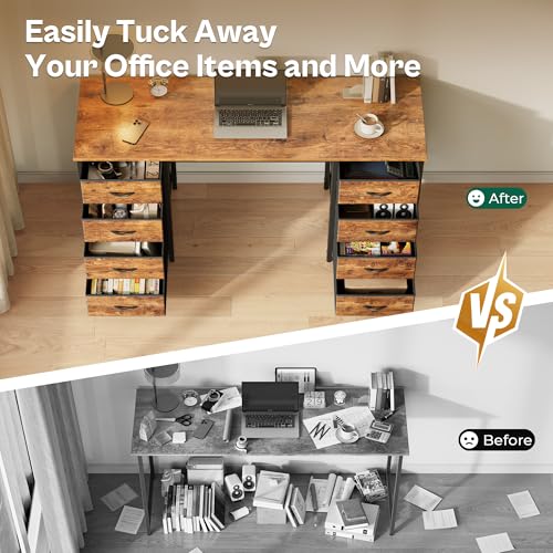 Huuger 47 Inch Computer Desk with 8 Fabric Drawers, Office Desk Work Desk for Home Office, Study, Gaming Desk with Drawers, Large Storage, Rustic Brown