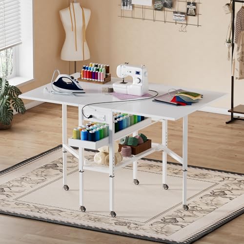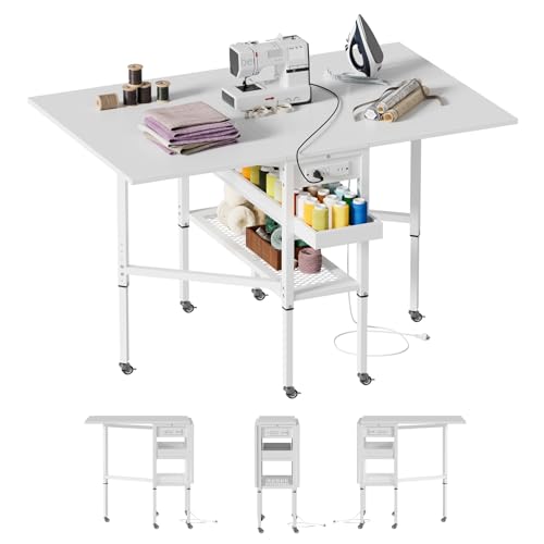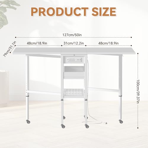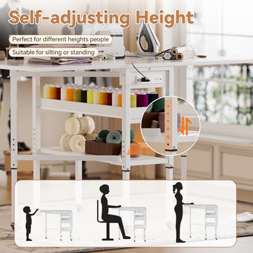 PAKASEPT Height Adjustable Sewing Cutting Table with Charging Station, Folding Craft Table with Storage,Movable Shelves for Large Fabric, Mobile Sewing Desk for Home Office Sewing/Craft Room,White