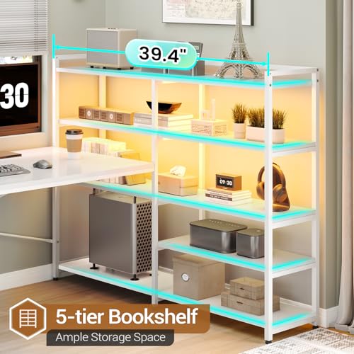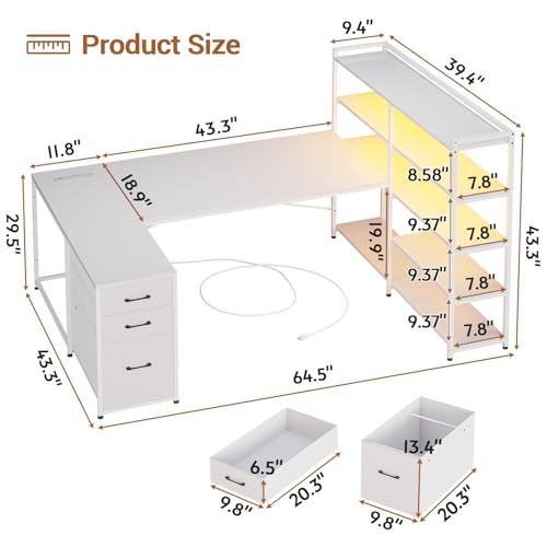 SEDETA White Computer Desk with Drawers, 64.5″ Reversible Office Desk with Fabric File Drawer, Corner Computer Desk with Power Outlet & LED Strip and Storage Bookshelf