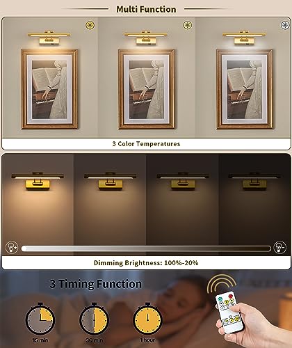 Battery Operated Picture Lights with Remote and Timer,Wireless Art Light for Paintings with Adjustable Swing Arm Gold Gallery Lights 12in Rechargeable Wall Sconce