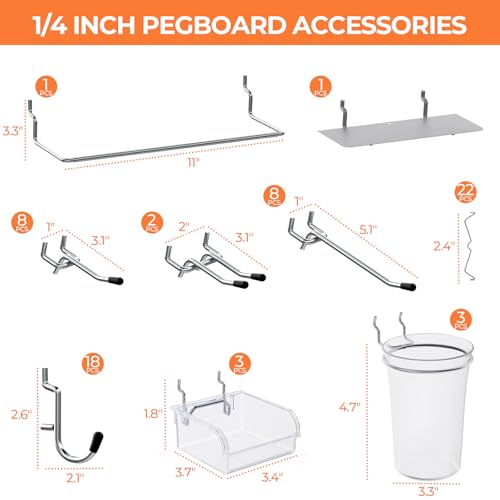 1/4 INCH PEGBOARD HOOKS: The peg board hooks are made of hardened steel construction to provide maximum strength, more sturdy and corrosion-resistant. Made of harder and thicker plastic, the pegboard bins and cups are installed with exclusive hooks to hang, sturdy for long time use