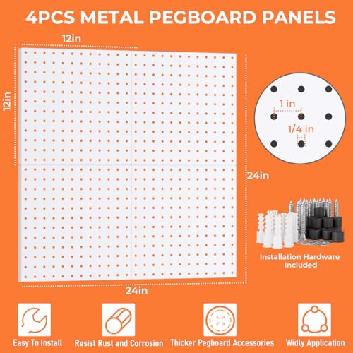 METAL PEGBOARD PANELS: With 12″x12″ size, the 4pcs white peg board are made of high quality metal material, and the all metal construction and galvanized finish provides maximum strength, resist rust and corrosion. More sturdy and durable than the ABS or plastic materials