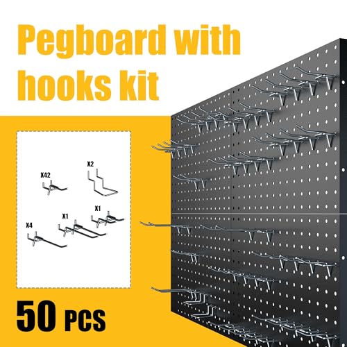 Peg Board, 4 Pack Metal Pegboard Panels with 50 Hooks, Black Pegboards Wall Organizer, Heavy Duty Peg Board for Walls Home, Garage Tool Storage, Office Organization, Craft Room, Kitchen
