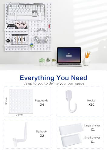 Pegboard Wall Organizer Kit – Heavy Duty 20lbs Load Bearing, Easy Installation, 4 Peg Board Panels 14 Accessories – Multi-Surface Use For Garage, Office, Kitchen & Crafts (White Pegboard,24″×24″)
