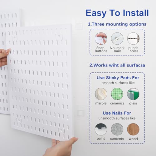 The Peg Board Organizer Three Ways Of Installation – No Drilling Required:1-No Drilling Installation: 16-Piece Self-Adhesive Mounting Bracket Easily Secures To Smooth Surfaces (24-Hour Curing Time Is Required For Best Results).2-16 Non-Tracking Nail Brackets For Latex Painted Walls And Wallcovering Walls.3-Traditional Drilling Installation: Comes With 16 Screws And Expansion Anchors For Textured Walls Or Rough Surfaces And Extreme Loads.