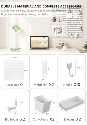 SIZE, WEIGHT, AND MATERIAL:This pegboard set includes a variety of components, such as 4 pegboards (11.8″ x 11.8″), 10 small hooks (2.2″), 2 large hooks (2.2″ x 4″), 2 long shelves (7.8″ x 4″), 2 small square storage shelves (4″ x 3.5″ x 3″), and 2 photo clips (3″ x 0.7″). The compact size and lightweight design make it easy to install and move around, enhancing its usability.