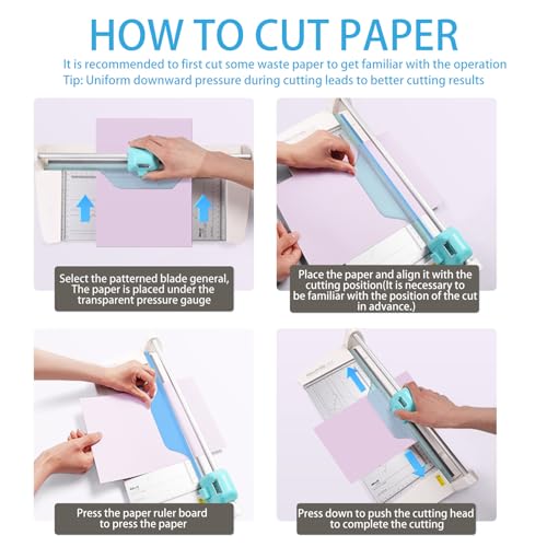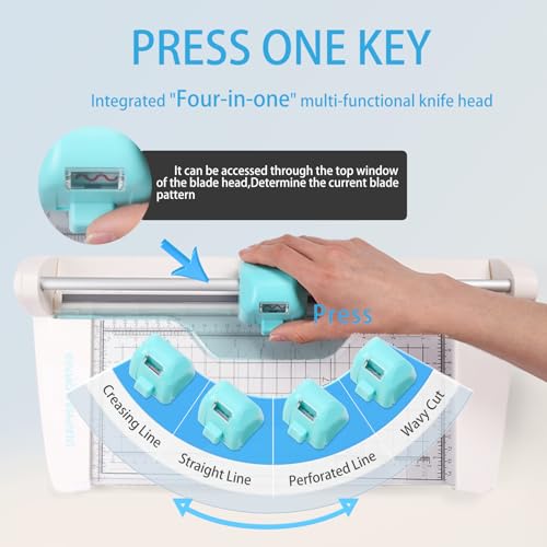 4-in-1 Paper Cutter: The multifunctional rotary paper trimmer has 4 types of rotary blades, Visualized blade head, switch with one finger. Featuring straight cut, wavy cut, and perforating cut, with 8 sheets capacity for straight cut &6 sheets wavy & 6 sheets perforating cut &6 sheets score at a time; the paper trimmer for crafting is excellent, scrapbooking projects, and everyday home/small office use