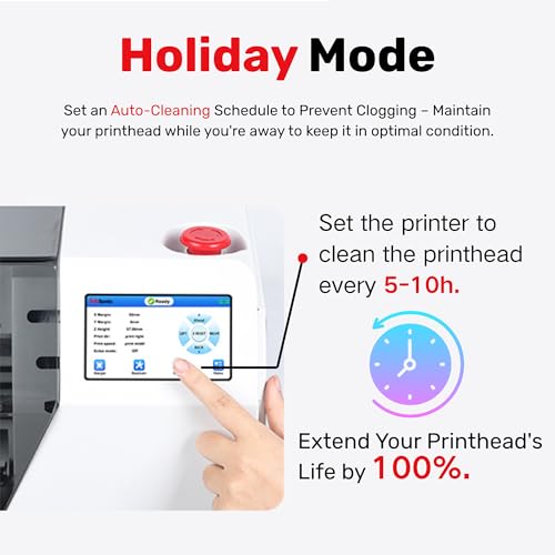 ✅ [Printhead Maintenance System] The 3-in-1 white ink circulation, mixing, and filtration system, paired with automatic cleaning, waste ink collection, and a moisturizing device, prevents printhead clogging with minimal maintenance. The printer auto-cleans every 10 hours when powered on. For vacations, keep it on (uses ~1 ml ink/day) or use moisture-retaining cartridges.