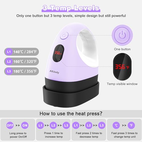Usage Method: The ARJudy mini press machine only have 1 button for setting: long press to power ON/ OFF, press 1 time to increase temp from L1 to L2, L3; press 2 times to decrease temp from L3 to L2, L1; press 3 times to change temp unit (℃ / ℉)