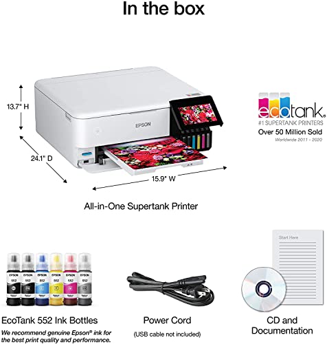 Epson EcoTank Photo ET-8500 All-in-One Wireless Color Supertank Printer with Scanner and Copier – Print Scan Copy Fax- Auto 2-Sided Printing – White-Bundle with Ahaghug Printer Cable.