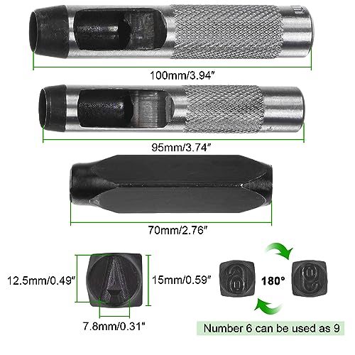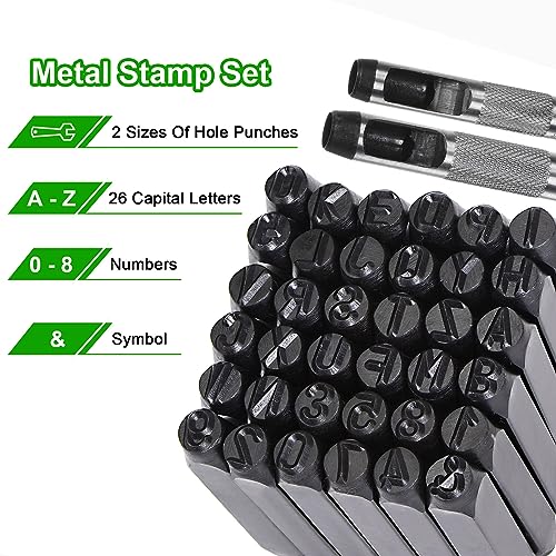 HARFINGTON 36pcs Metal Stamping Kit 1/2″ (12.5mm) (A-Z, 0-8, “&” Symbol) Steel Letter Punch Press Tool with Hole Punch to Stamp on Metal, Plastic, Wood, Leather, Black