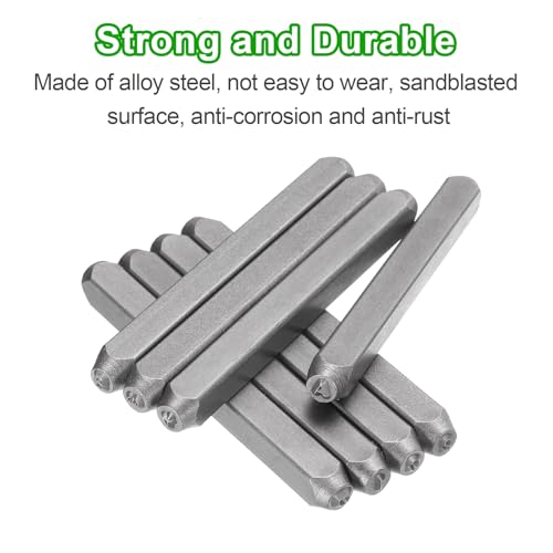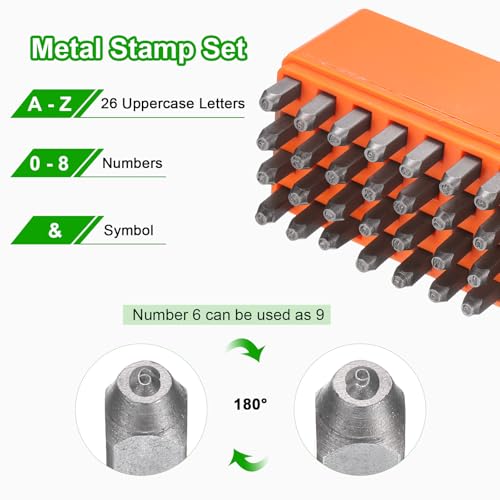 Size – Letters: 2x2mm / 0.08×0.08 inch (LxW); Steel bars: 60x6x6mmmm / 2.4×0.24×0.24 inch (LxWxH); Package includes: 36 x metal punch stamps (26 uppercase letters from A to Z, numbers from 0 to 8, an ‘&’ symbol, the “6” stamp can be used as a “9”)