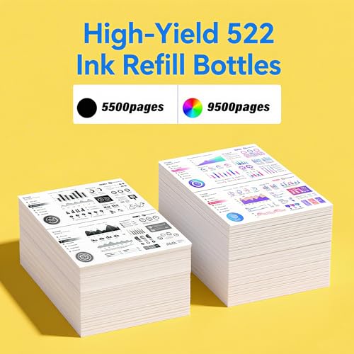 PAGE YIELD: Up to 9,000 pages per Compatible for 522 black ink, Up to 6,000 pages per Compatible for color 522 ink bottles. ( at 5% coverage on A4 paper)