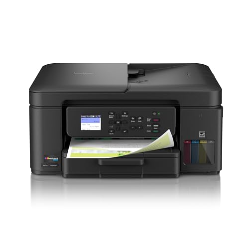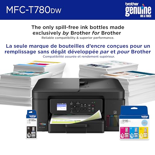 With long-lasting durability, productivity-boosting features, and a value-driven refillable ink tank, the Brother INKvestment Tank MFC-T780DW Wireless Color Inkjet All-in-One Printer with Duplex Printing is a no-brainer for your home office or small office. An incredible three years of ink is included in the box(1), for worry-free personal and business printing without the need for frequent ink refills, plus a 3-year limited warranty(2) and Brother customer service for peace of mind. An innovative refillable ink tank provides an easy and practical solution for ink replenishment, with fast refill speeds and spill-free ink bottles that are keyed to help avoid inserting them into the incorrect color slot. Plus, you’ll do your part to reduce cartridge waste in landfills. Enjoy feature-rich functionality with an easy-to-load 150-sheet paper tray(5), 1-sheet manual feed slot, single-sided automatic document feeder (ADF) and flatbed scanner/copier capabilities, automatic duplex (2-sided) printing, wireless connectivity, and the ability to print from virtually anywhere with the Brother Mobile Connect app(4). Produce beautiful prints in vibrant color and bold blacks at fast print speeds with Brother Genuine BTD180 Ink bottles – the only brand we recommend for your Brother printer. Disclaimers: (1) Based on average monthly print volumes of 150 pages at 60% black pages and 40% color pages. (2) Maximum total warranty coverage is 3 years. (3) Requires an internet connection and an account with desired service. (4) Free Brother Mobile Connect App download, wireless connection and connection of an eligible printer with Brother are required. Compatibility may vary by device, operating system and country. (5) Maximum Capacity based on using 20lb. paper. (6) Based on ISO/IEC 24734 (after first set of ISO test pages). For inkjet print speed methodology, please visit www.brother-usa.com/printspeed.
