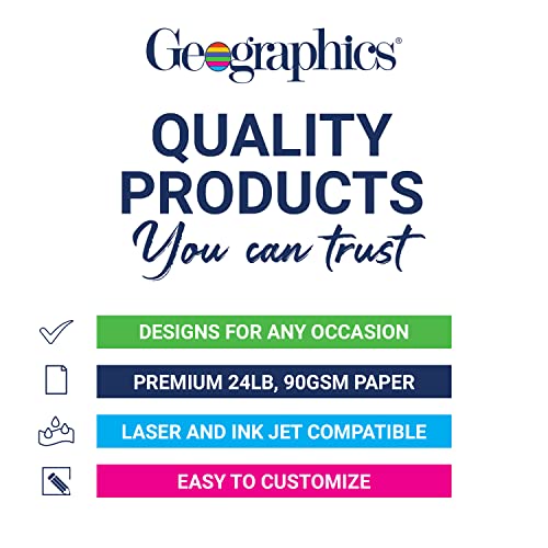 Make Professional Invitations On Your Own You can make outstanding letters, signs, greeting cards, announcements, arts and crafts, and flyers by yourself – all you need is high quality letterhead paper. Excellent for award ceremonies, graduations, and any distinctive event. Customization is easy: simply use inkjet and laser printers, copiers, or hand calligraphy on these 32 lbs heavyweight printer papers. You can even use Geographic’s iClickNPrint online design center for fast, easy customization. Measuring 8.5 x 11 inches, these fine stationery flyer templates fit any ordinary printer. This product has the Geographics’ seal of approval. We are an American family-owned leading manufacturer and marketer of quality paper, board, packaging, and converted paper since 1912.
