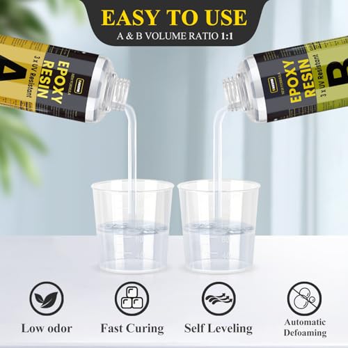 EASY TO USE & FASTER CURE – Our kit include 8oz uv resistant resin and 8oz uv resistant hardener.As long as mixing 1:1 ratio by volume of the resin and hardener,it cures quickly within 8-24 hours.Requires no experience, even if you are new to resin.To make a perfect finish in cold weather:Prewarm resin and hardener before using.