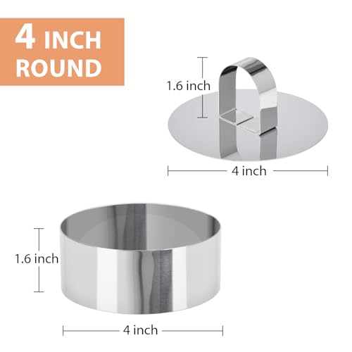 HULISEN Round Cake Ring Mold, Stainless Steel 4″ Cooking Crumpet Rings with 1 Pusher & 4 Food Form, Tuna Tartare Mold for Pancake, Salad, Mousse