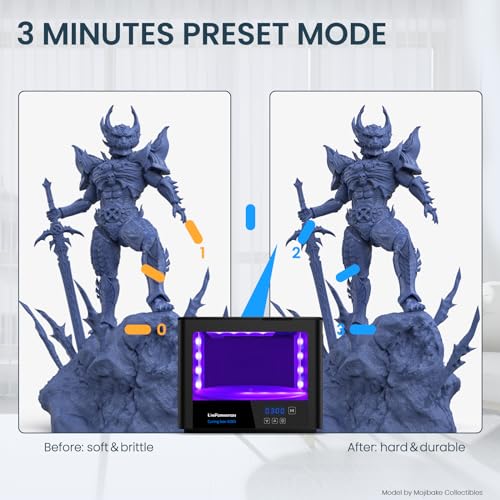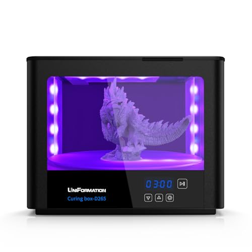 【Enhanced Curing Power】With 16 UV lights and 4 LED strips strategically placed on every side, complemented by an automated rotating turntable, this 405nm UV light box guarantees uniform curing of your resin prints. Not only does it bestow a lustrous finish and enhanced durability to the surface, but it also plays a crucial role in preventing both over-curing and under-curing defects.