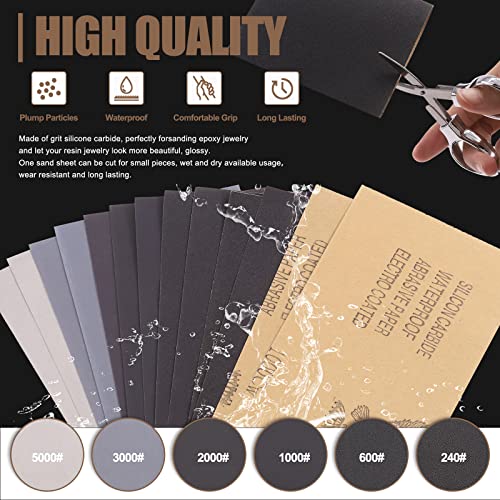 With 12Pcs Sandpapers —— Package include 6Pcs sand papers (240#, 600#, 1000#, 2000#, 3000#, 5000#) Made of grit silicone carbide, perfectly for sanding epoxy jewelry and let your resin jewelry look more beautiful, glossy. One sand sheet can be cut for small pieces, wet and dry available usage,wear resistant and long lasting.