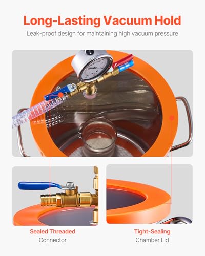 5-Gallon Vacuum Chamber: Crafted from high-quality stainless steel, our vacuum chamber for resin is built to withstand high pressure without warping or deforming. The fully transparent acrylic lid allows you to easily monitor the degassing process, giving you full control over your results.
