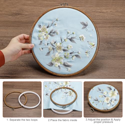 To use a decorative embroidery hoop, simply separate the two loops easily, then place the fabric over the white loop, cover with the outer loop, and apply proper pressure to keep the cloth and double loop together and you are ready to start embroidering!
