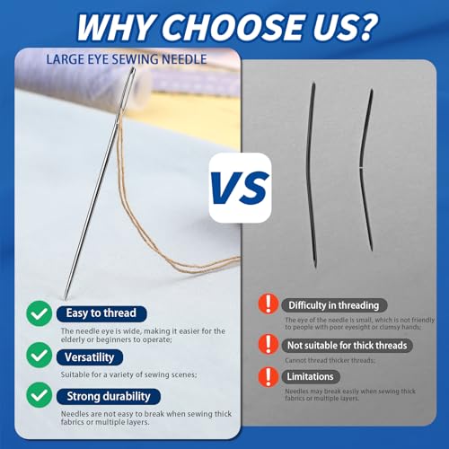 Large eye needles material: Our hand sewing needles are made of stainless steel, not easy to rust, durable, and sewing needle can be used many times. The yarn knitting needle holes are large and can easily pass through the fabric