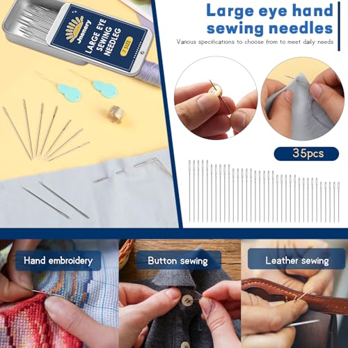 35 Pcs Large Eye Sewing Needles, 7 Size Sewing Sharp Needles for Handsewing, Leather Embroidery Thread Needle, Stainless Steel Yarn Knitting Needle with Threader, Thimble for Crafts, Repair, Quilting