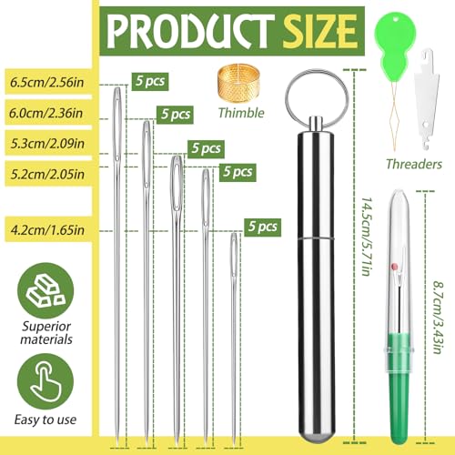 Package includes: The embroidery needles kit includes 25pcs large eye sewing needles(5 sizes), 5pcsx2.5inch, 5pcsx2.3inch, 5pcsx2.09inch, 5pcsx2.05inch, 5pcsx1.65inch, and 2pcs threaders(randomly colors), a thimble, a seam ripper.