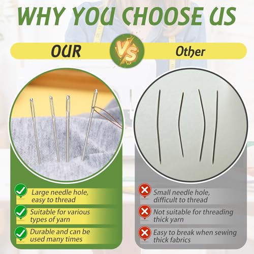 High quality: Our large sewing needles are made of stainless steel for long-lasting durability, the big eye needles are sharp to easy pass through various fabrics, such as leather, belts and denim. The yarn knitting needle holes are large, with smooth surface, not easy to bend.