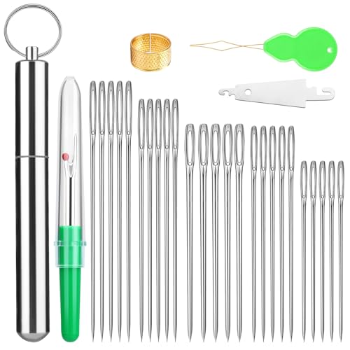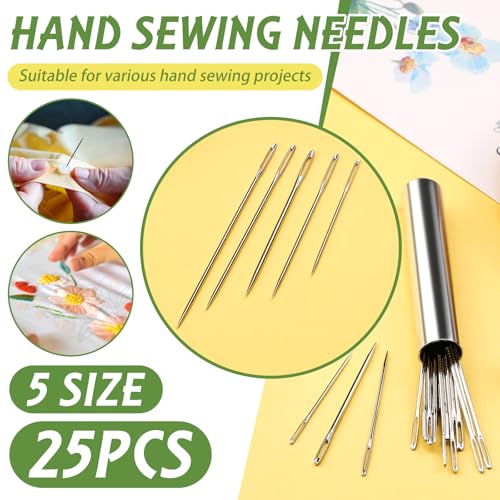 Fteven Embroidery Needles, 25PCS Large Eye Sewing Needles, 5 Size Hand Sewing Needles with Aluminium Storage Tube Threaders,Sewing Sharp Needles for Stitching Crafts, Quilting