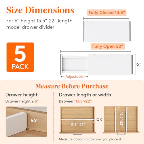 Lifewit 5 Pack Drawer Dividers Plastic 6″ High, 13.5-22″ Adjustable Drawer Organizers for Clothes, Expandable Dresser Separators in Bedroom/Bathroom/Kitchen/Fridge/Office Organization and Storage