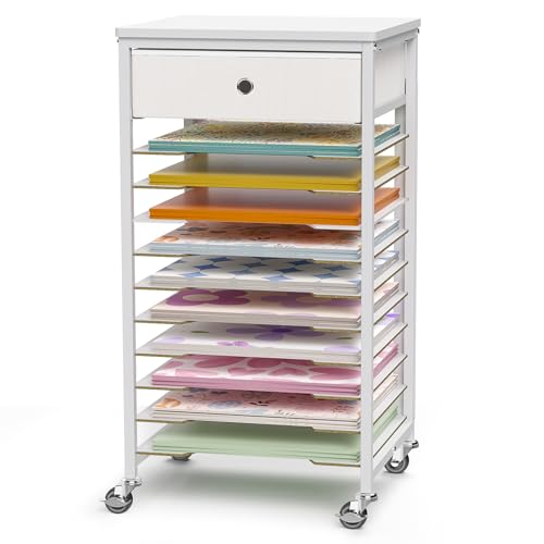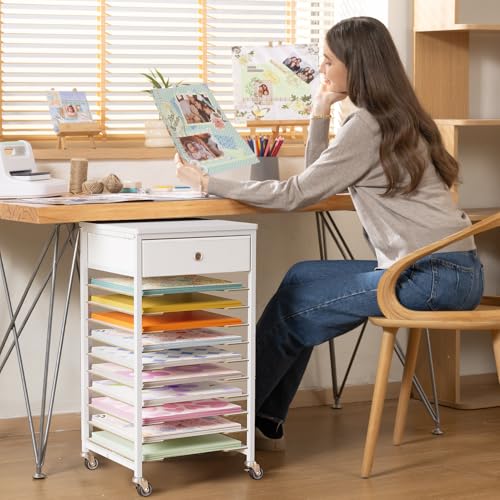 Caydo Scrapbook Paper Storage – 10 Tier Rolling Storage Cart with Drawer and Table Workstation, 12×12 Paper Storage Organizer for Craft Room Home