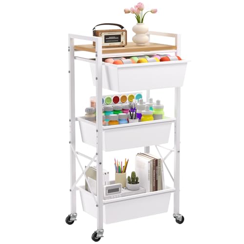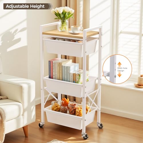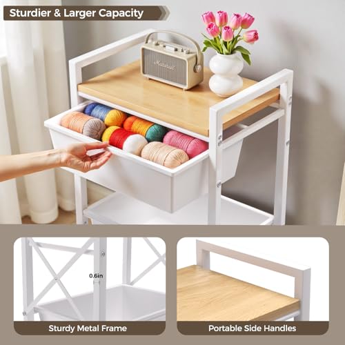 3 Tier Rolling Utility Cart with Drawer, Plastic Drawer Storage Snack Craft Book Cart with Lockable Wheels & Wood Tabletop, Metal Shelf Storage Organizer Cart for Kitchen, Bedroom, Office, White