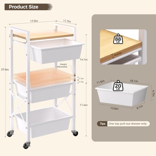 【Sturdy and Durable】: The frame of the storage cart is made of high quality metal, waterproof and rustproof, sturdy and stable; the drawers are made of high quality PP material, which can hold up to 20 lbs; the table top of the cart is made of natural wood, which can hold up to 88 lbs weight. The second layer of multi-hole position design, adjustable height, according to the products placed, choose to adjust to the appropriate height.