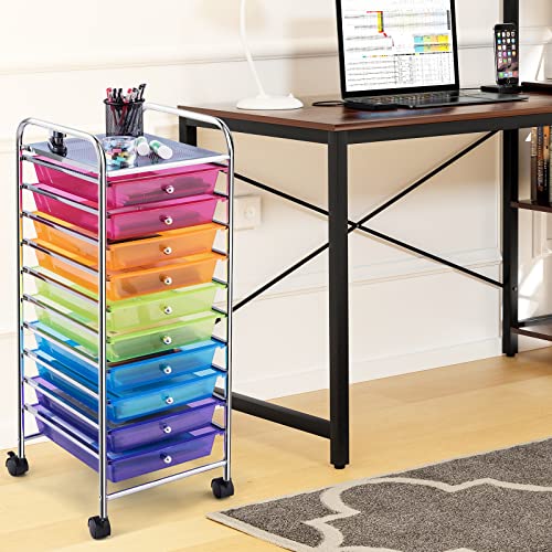COSTWAY 10-Drawer Rolling Storage Cart, Utility Mobile Trolley with Removable Drawers & Universal Casters & 2 Brakes, Versatile Flexible Drawer Organizer Cart for Home, Office (Rainbow)